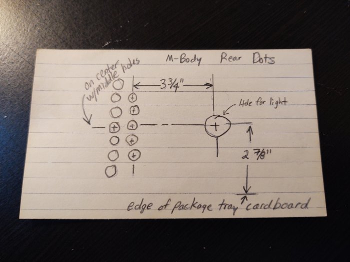 measurements I used to install. derived from numerous photos/reference materials. this is what I used for the images above, measure a bunch of times because the punched holes in the package tray are not parallel/possibly different on your application. The outfitters roughed these in, I probably over-thought the whole process