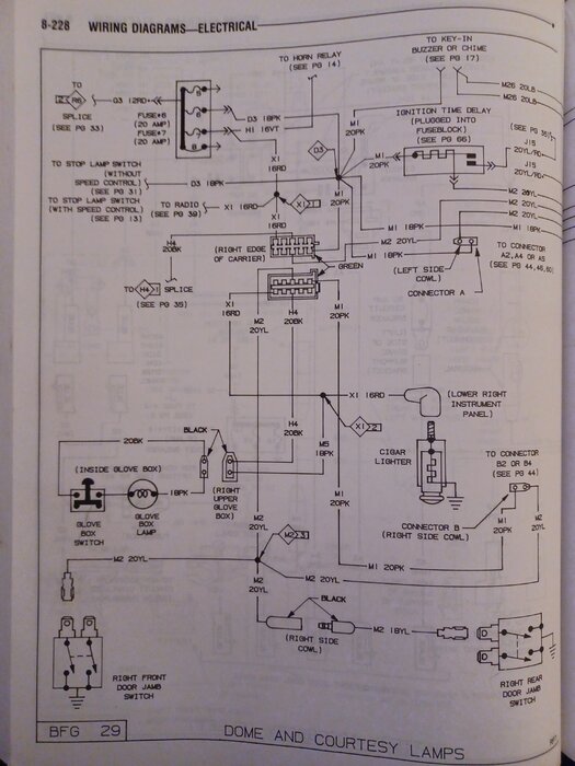I don't know how well these pictures will turn out, but these are the fuses for the car, the connections in the column, and the wiring diagram for the dome light. This is all 87 specific. 88 is different. Idk about 86, probably different too because mopar changed little things year to year.