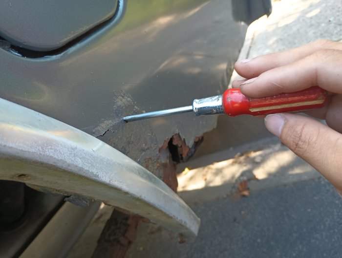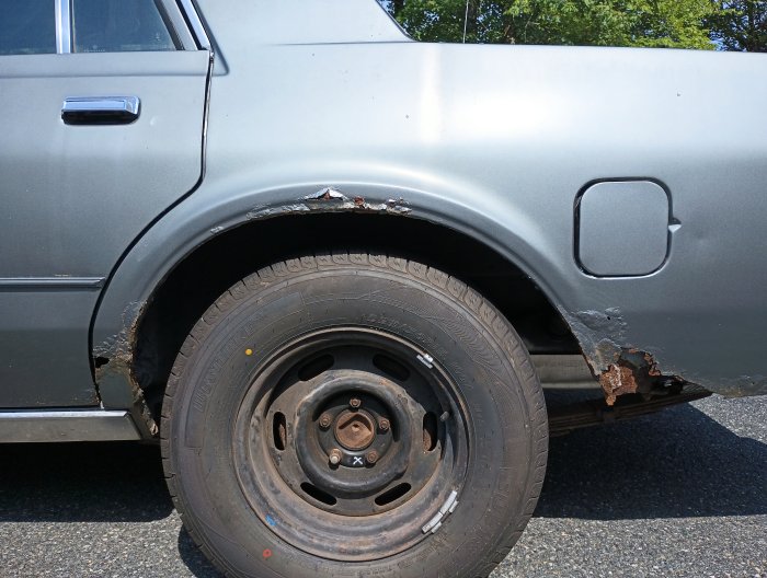 just as i suspected. the wheel arch trims were hiding many horrors. this rust is both worse and not as bad as i thought at the same time. thankfully this is the worst on the body. this looks BAD. almost unsalvageable bad. other side's looks much more manageable. doors should be easy to patch. the whole drivers side rear quarter panel will need to come off. it's as the kids say: COOKED. you can poke it with your finder and it goes through. very disappointed it ate away the part closest to the rear door. though that area being small might also be a blessing. can weld new metal there. at least it isn't Detroit Diplomat levels
