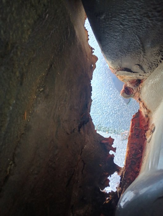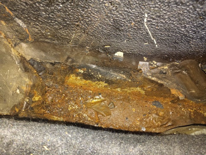 You're gonna need new quarters to do it right. Find some unlucky 5th ave and take an angle grinder to itsides of the trunk are nearly completely rotted out. faulty antenna plug hole. can look through and see the street. driver's side i showed earlier is the worst of it but the passenger side was full of water. got up as much as i could. luckily we're having a heat wave so it can dry out. think I'm going to see a professional about the driver's side. i can say in confidence however the cabin is solid. and this car was originally grey not brown. center of the trunk looks fine just these sides. wondering if the red is filler. i recall dad had rust fixed on here before when the car got repainted. it's likely this hole is simply the plaster panel having fallen off. bubble on passenger side is 100% fiberglass filler