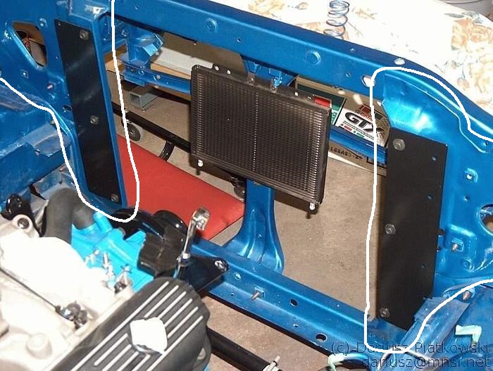 A fellow forum members car. He made brackets to convert his 22” wide (I suspect) radiator to a 26”. This will push the radiator closer to the water pump a tad. He still has a problem of the air entry hole being smaller (if that is a concern to you).