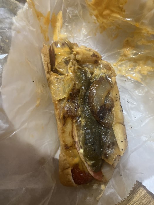 Every region has its own hotdog tradition that usually makes no sense.Chicago is known for hotdogs. Far as I’m concerned, this is the hotdog. The Chilango. Grilled Vienna beef hot dog, bacon, tomato, grilled onion, grilled poblano pepper, zesty cheese sauce. The picture does not do it the justice it deserves. Comes with a big bag of fries and a drink (I go for the kool-aid on tap). It is my absolute favorite Chicago treat. Tommy’s on Grand.