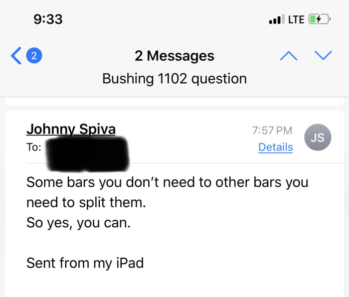 Edit: thanks for the replies. I had heavily weighed the option of slicing the bushing and positioning it so the split would be lined up with the seam where the two shells come together (so the force on the bar end wasn’t directly on the cut) but, as Aspen mentioned, the concern of the bushing walking out was my first thought and I don’t want to waste good Poly Bushings. Johnny had made this set to order and I don’t want to chance them not being available now.